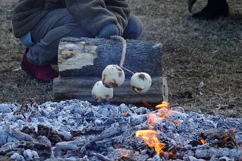 どんど焼きの火で焼いただんごを家族で分け合って食べると